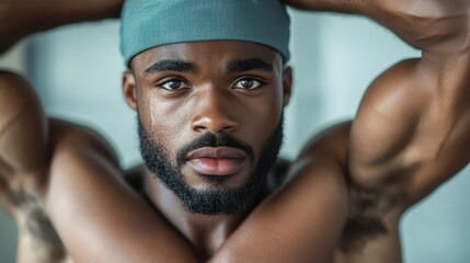 A man in a gray cap poses with his arms raised, muscles flexed, exuding strength and focus. The background is softly blurred, highlighting the intense expression.