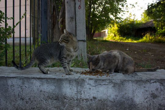 Two gray cats sleep together, hug and care. Show tenderness, lie on a soft white knitted sweater.