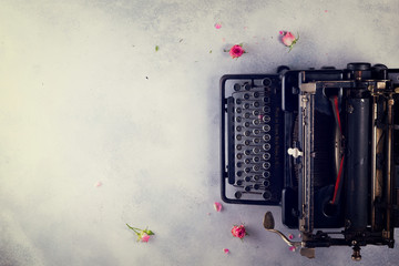 Workspace with black vintage typewriter on gray desktop, retro toned