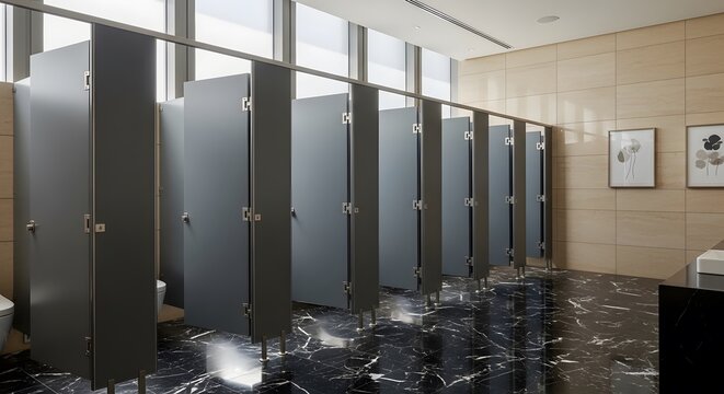 Modern Restroom with Gray Toilet Partitions and Marble Floor