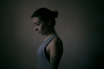 portrait of a girl in a gray shirt in the dark on a neutral background
