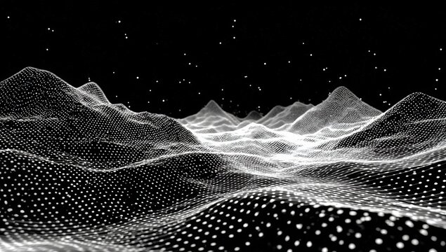 A fluid, grayscale representation of a surging wave form. The crest curls inward with a frothy, pixelated texture, transitioning into smoother gradients as it descends