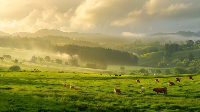 Idyllic sunrise over rural fields with grazing cows in pastel skies