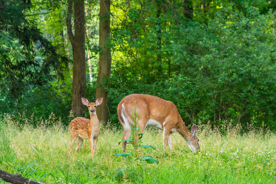 Baby deer fawn and mother deer doe grazing in field near forest