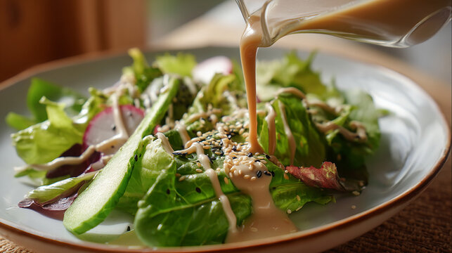 Japanese-style sesame dressing poured over fresh gre