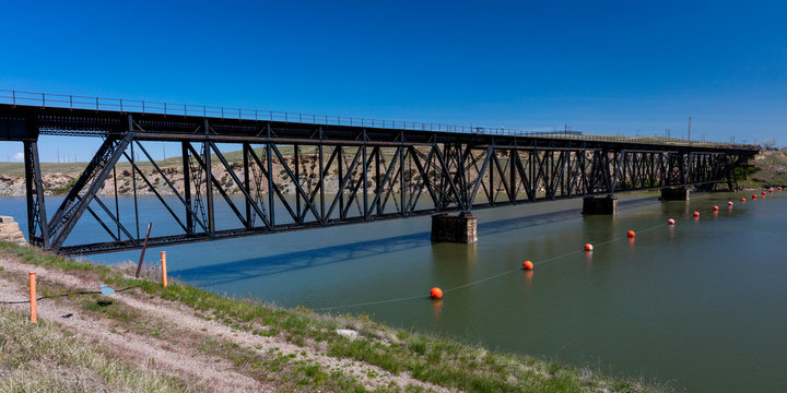 MAY 23 2019, GREAT FALLS AREA, MONTANA, USA - Old Railroad bridge across Missouri River near Great Falls, Montana