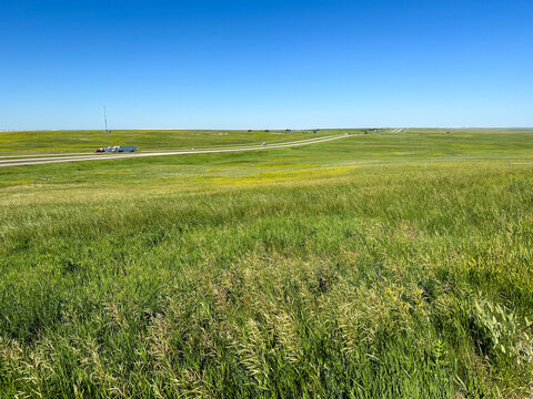 Interstate 90 through the vast open landscape in the Great Plains prairie grassland