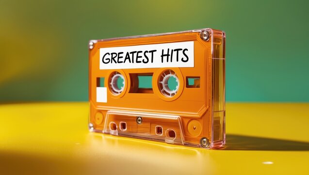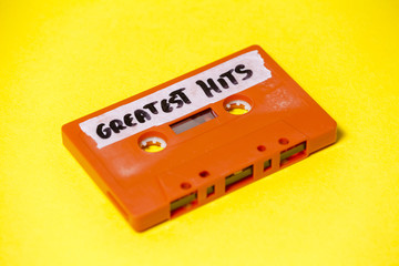 A vintage cassette tape (obsolete music technology), orange on a yellow surface, angled shot, carrying a label with the handwritten text Greatest Hits.