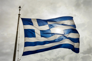 Greece sign symbol. Greek national official flag on flagpole waving in the wind, blue sky