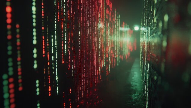 Dynamic Abstract Digital Corridor with Shifting Red and Green Binary Code Patterns