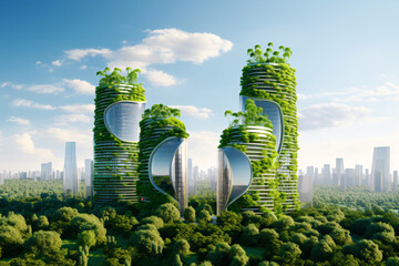 Futuristic green skyscrapers in an eco-friendly urban landscape