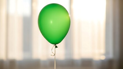Green balloon tied with string indoors.