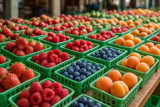 Colorful Display of Fresh Berries and Fruits in Green Baskets at Market
