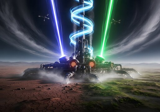 Futuristic aerial view of a city at night, bathed in neon green beams from a hovering object