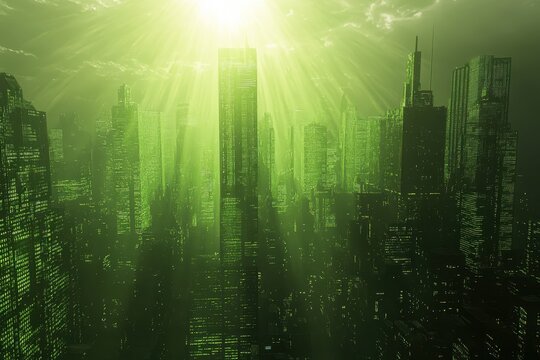 Dystopian cityscape with green beams shining through a cloudy sky, Dystopia city world burt sky green beams 3d seamless