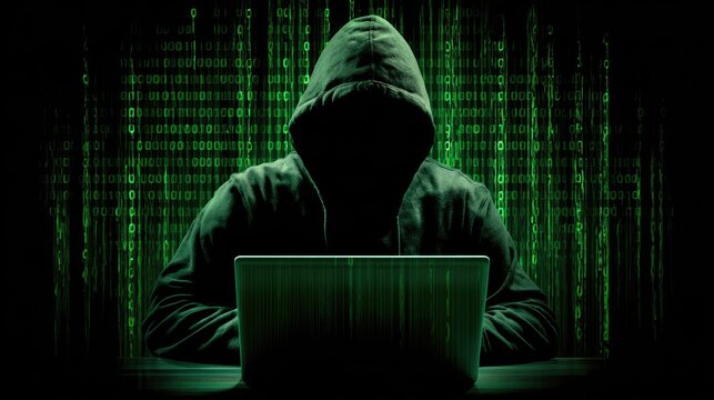 Silhouetted man, a hacker, uses a laptop in a dark room with green digital code and light rays in the background. Cyber attack.