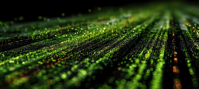 Green digital rain of binary code cascading down, creating a futuristic, immersive digital landscape.