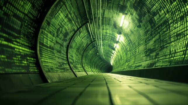 Abstract Digital Corridor Futuristic Green Teal Code Data Stream Technology Background Modern Network Server Binary Code Lines Neon Lights Digital Art
