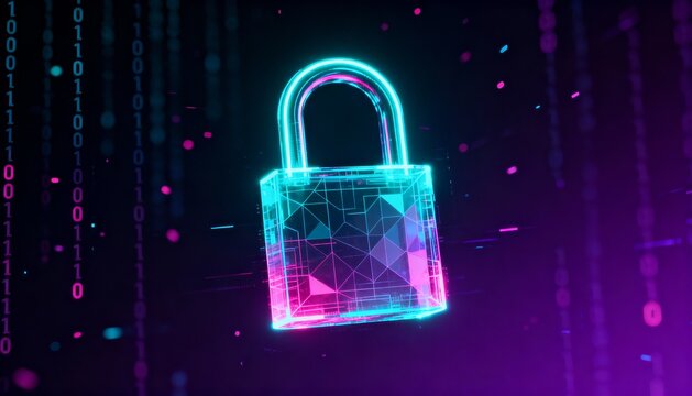 Glowing digital padlock hologram floating in cyberspace, cyber security concept, dark futuristic background with binary code