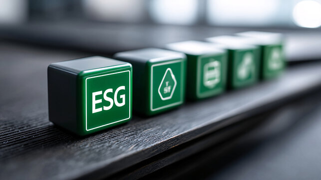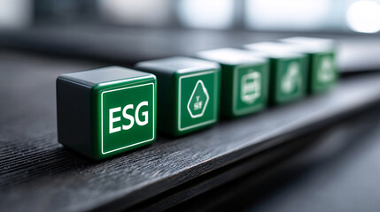 Three green blocks with icons representing environment social and governance on modern desk surface.