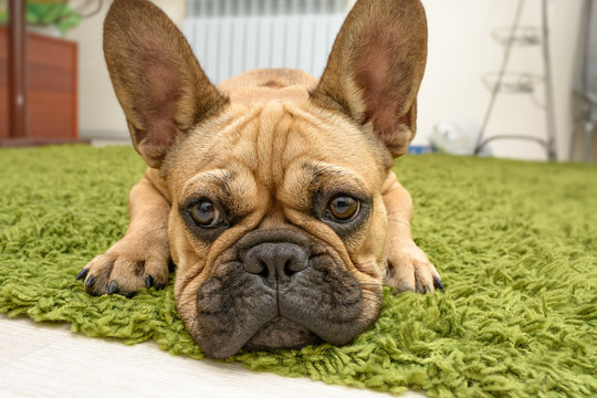 Playful dog joyfully playing on living room carpet