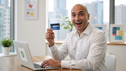 Businessman holding a glowing green checkmark symbol representing success, approval, and digital technology.
