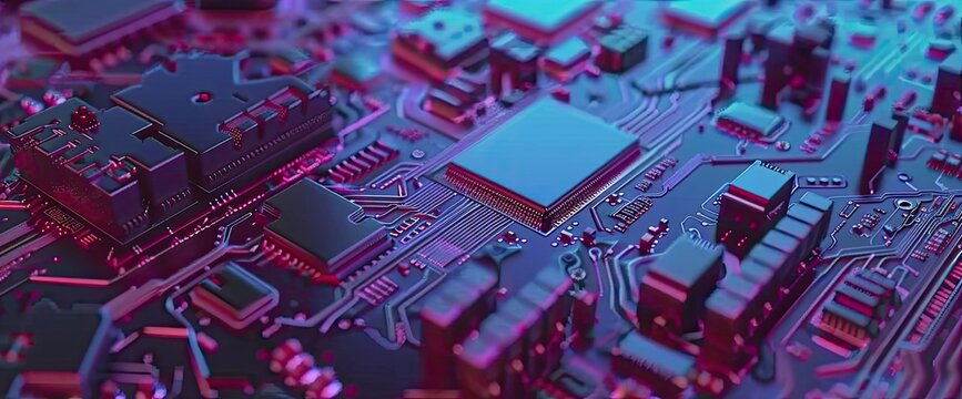 Futuristic circuit board design with glowing interfaces and electromagnetic waves