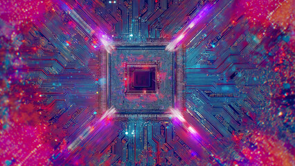 Futuristic glowing computer motherboard and AI microchip with purple, cyan, and green circuits for innovation and business growth