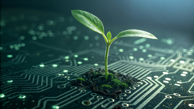 Small green plant sprouting from electronic circuit board representing sustainable technology, eco-innovation, green energy solutions, environmental technology and digital ecology concepts
