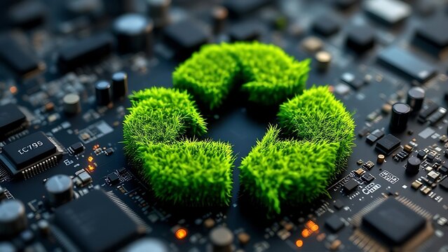 Concept of green technology. green recycle sign on circuit board technology innovations. Environment Green Technology Computer Chip.Green Computing, Green Technology, Green IT, CSR, and IT ethics