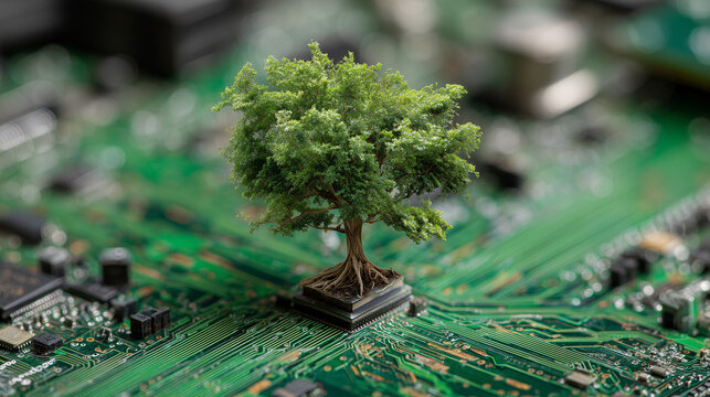 Tree growing on the converging point of computer circuit board. Green computing, Green technology, Green IT, CSR, and IT ethics. Concept of green technology. Environment green technology