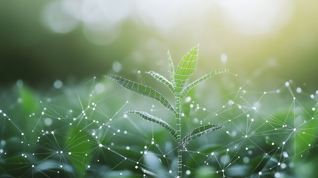 A wireframe model of a green plant with white digital data lines as a symbol for technology and ecology.