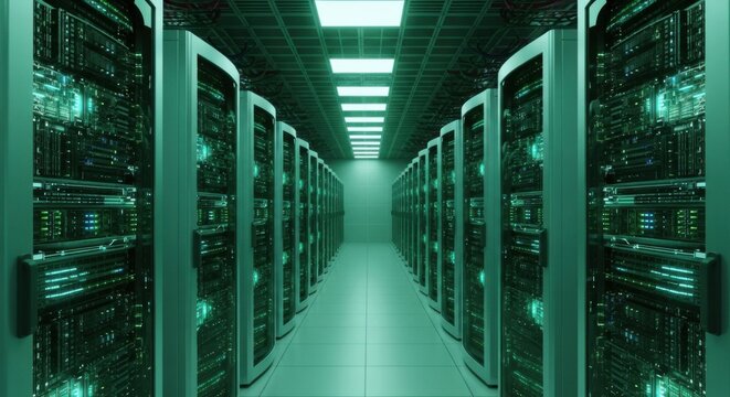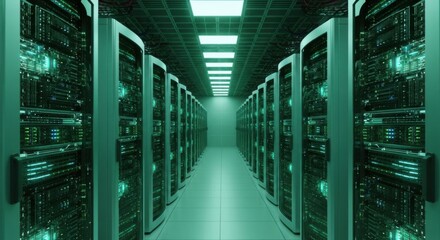 Illuminated digital server room infrastructure. Data center with rows of rack servers. Storage, hardware of network. Green lights, digital data processing and cloud computing tech environment.
