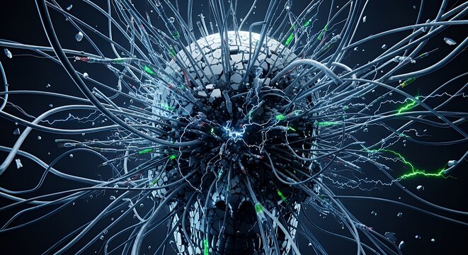 Futuristic digital neural network with interconnected neon-blue and green electrical pathways creating a complex brain-like structure in a high-tech