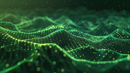 Abstract green digital landscape with pulsating waves and dots, creating mesmerizing visual effect. This evokes sense of depth and movement in futuristic setting