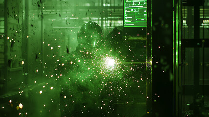 Glowing green digital data streams converge onto a central processing unit, forming a complex circuit board pattern
