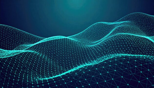 An abstract digital network grid with interconnected white dots, flowing in a wave-like pattern with a gradient of green and blue hues against a dark background