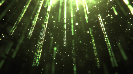 Futuristic green digital rain pattern on dark background, matrix-style cyber code concept for technology and programming themes. 3D rendering.
