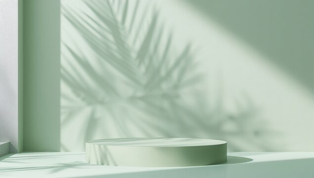 A light-filled, pale green display podium, subtly shadowed by tropical foliage, is presented against a muted backdrop.