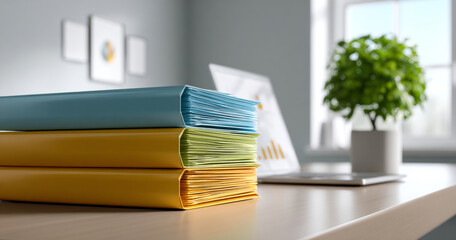 Stack of colorful folders on a desk with blurred laptop and green plant in modern workspace interior