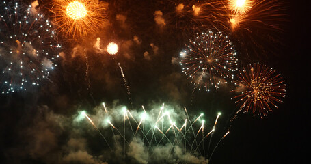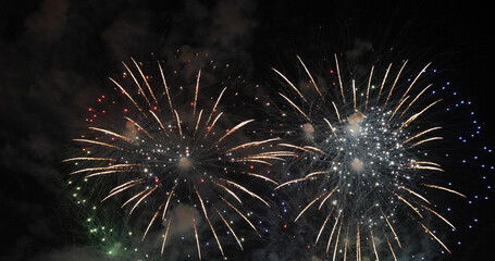 Vibrant celebration with fireworks in cloud-studded summer sky