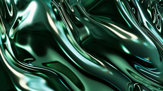 3D renderings of fluid shapes with green metallic textures. Metallic green fluid art with reflective swirls