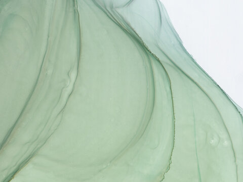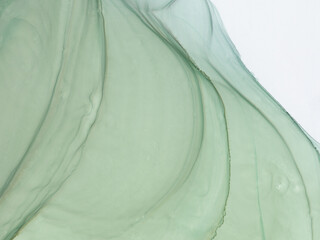 Abstract green art — green fluid background with beautiful smudges and stains made with alcohol ink. Green fluid texture with white background resembles cloth, leave, watercolor or aquarelle.