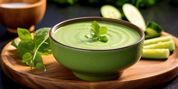 Green avocado gazpacho with shrimp and herbs, basil, lime, peaches, nasturtium leaves and purple onions. Spring and summer cuisine, healthy recipes full of proteins, fats and vitamins. Fresh seafood