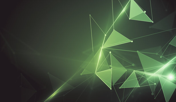 Glowing green polygonal network of nodes in dark space for futuristic data visualization