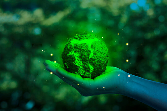 Man holding green glow globe on night nature background concept for future business growth and environmental sustainability and reduce pollution for future business and environmental growth.