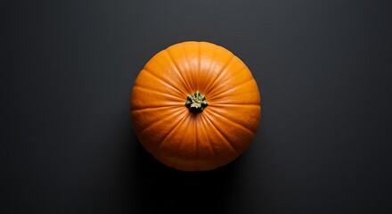 Top down view of a single orange pumpkin with a green stem on a dark gray background in a studio setting