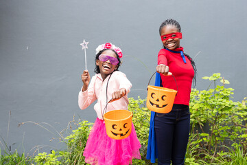 African American sisters posing wearing tutu holding pumpkin buckets star wand against gray wall