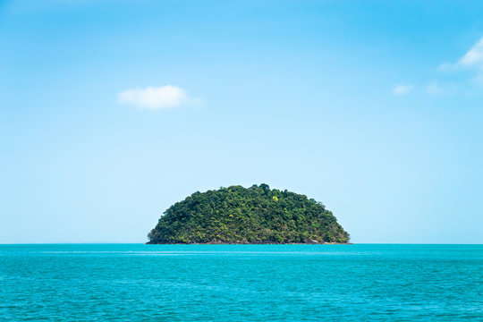 Rocky coastal island revealing lush green shrubbery, rustic buildings and pier over turquoise sea