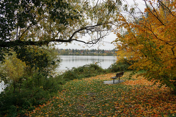 Sunlit urban park boasting central lake and winding paths against downtown skyline